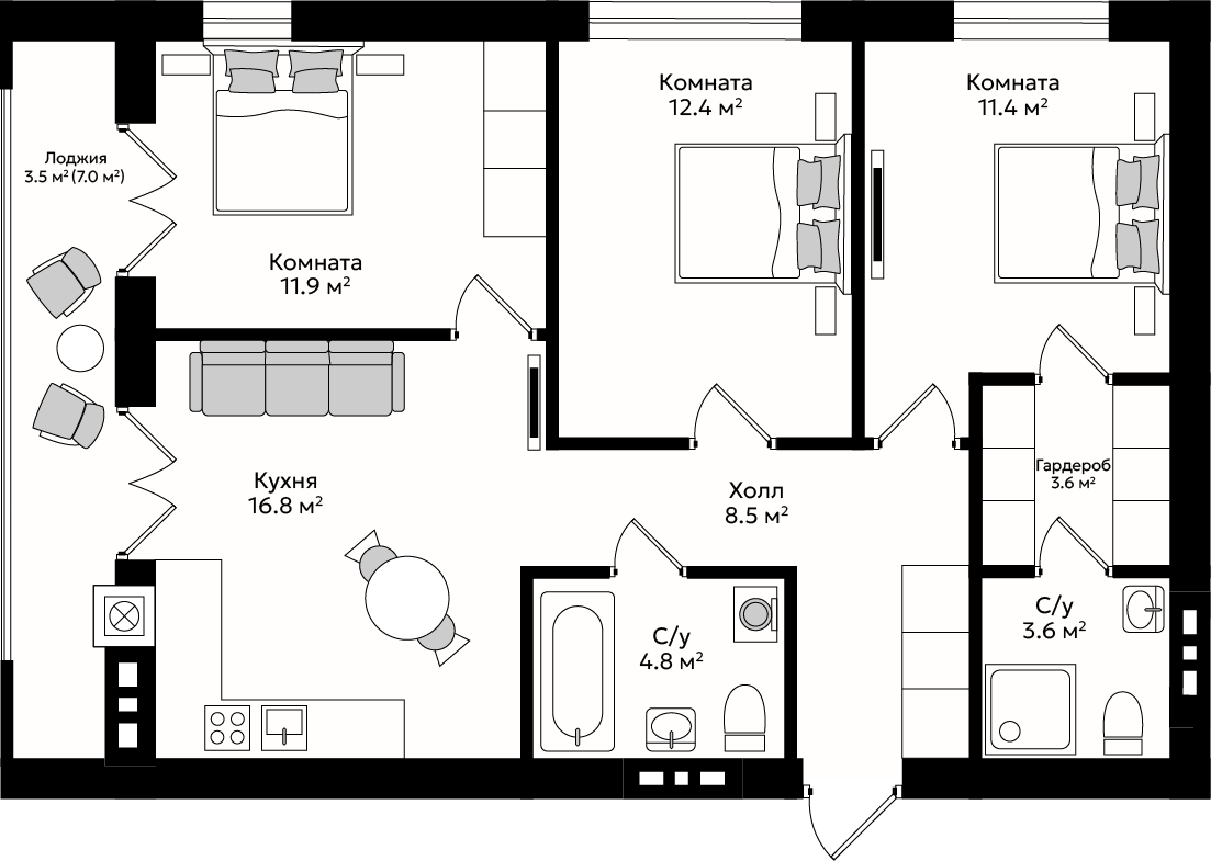3 спальни